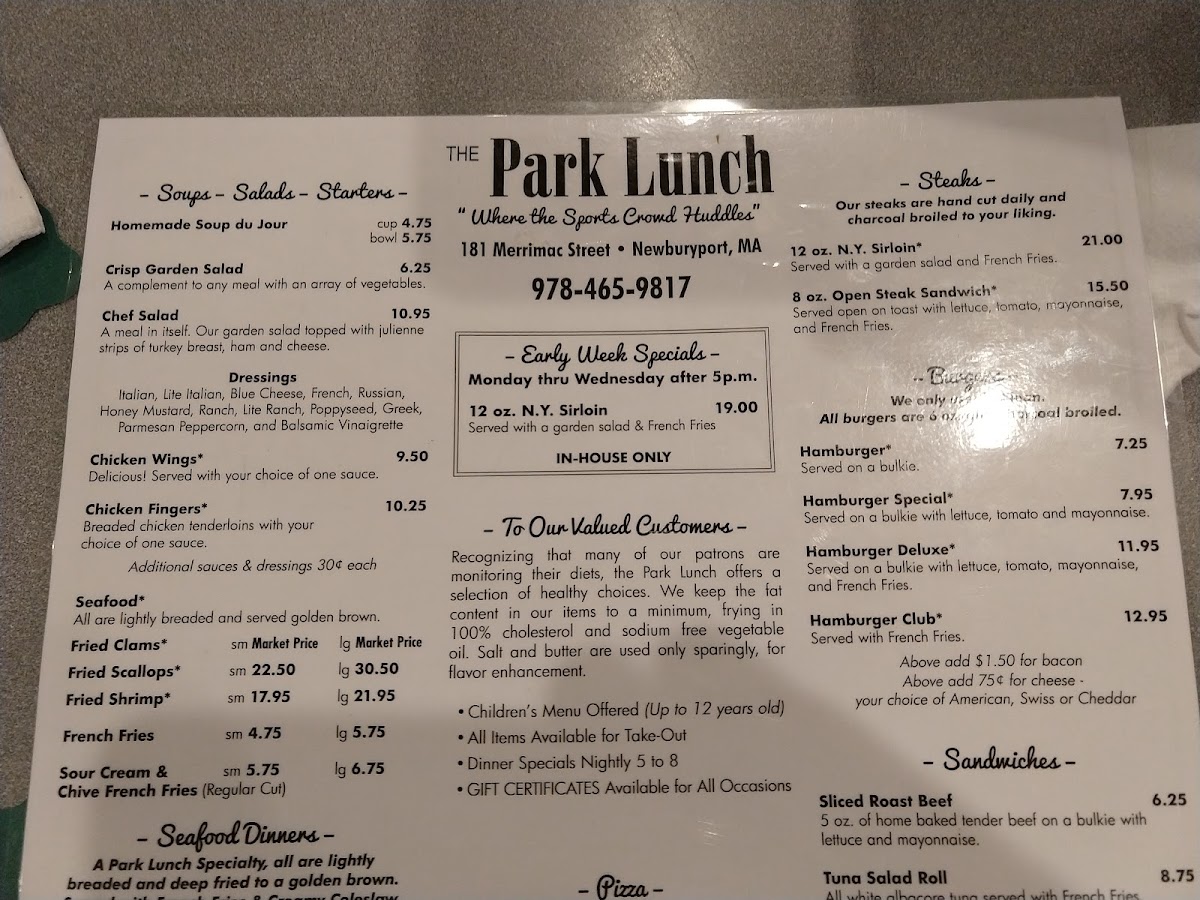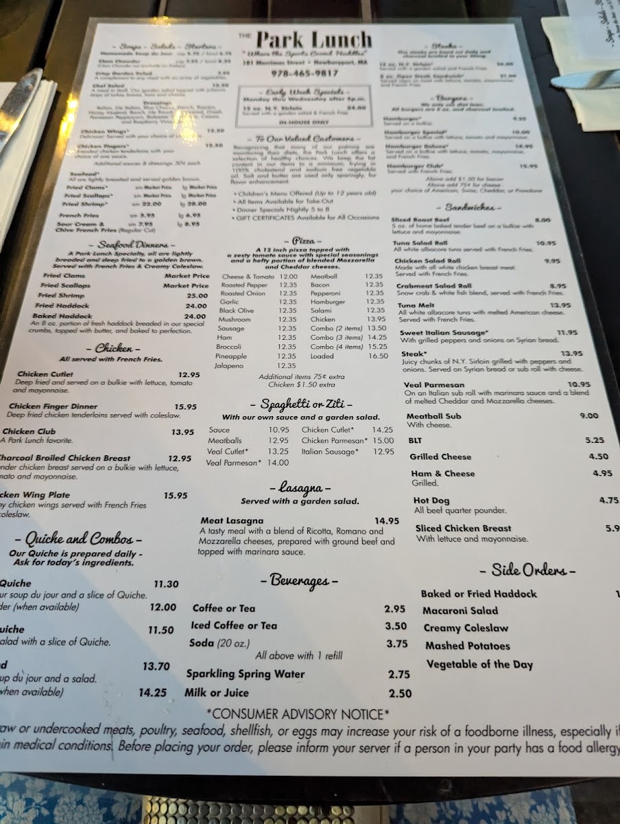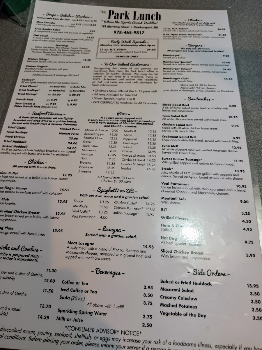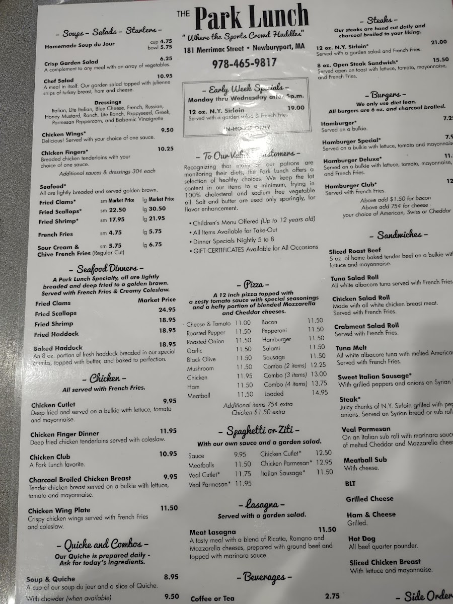 Located in the heart of Newburyport, Park Lunch offers a delightful, no-frills dining experience that captures the essence of local community charm. The inviting atmosphere features eclectic decor, including school flags and vintage sports memorabilia, creating a nostalgic backdrop for your meal. The menu is both concise and enticing, with highlights like their baked haddock, praised for its light and delicious flavors, and perfectly crispy fries. Seafood lovers can enjoy fried clams and scallops, consistently cooked to perfection, while the coleslaw strikes the perfect balance, earning rave reviews from visitors.